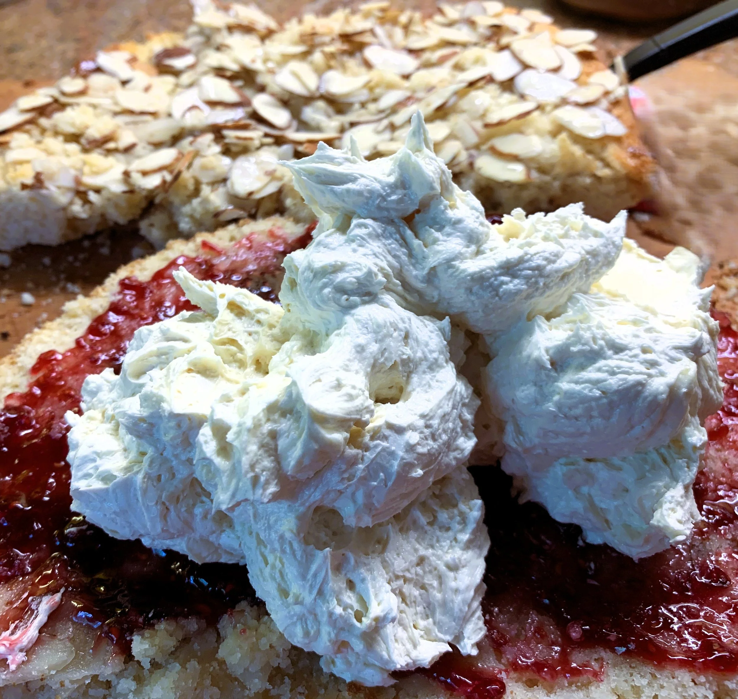 It’s a beauty! Rich and decadent with oodles of caramelized almonds on top and a smooth, buttery filling in the middle. The raspberry tang adds freshness. A German treat that can be served as cake slices or cut into smaller squares for a handheld treat.