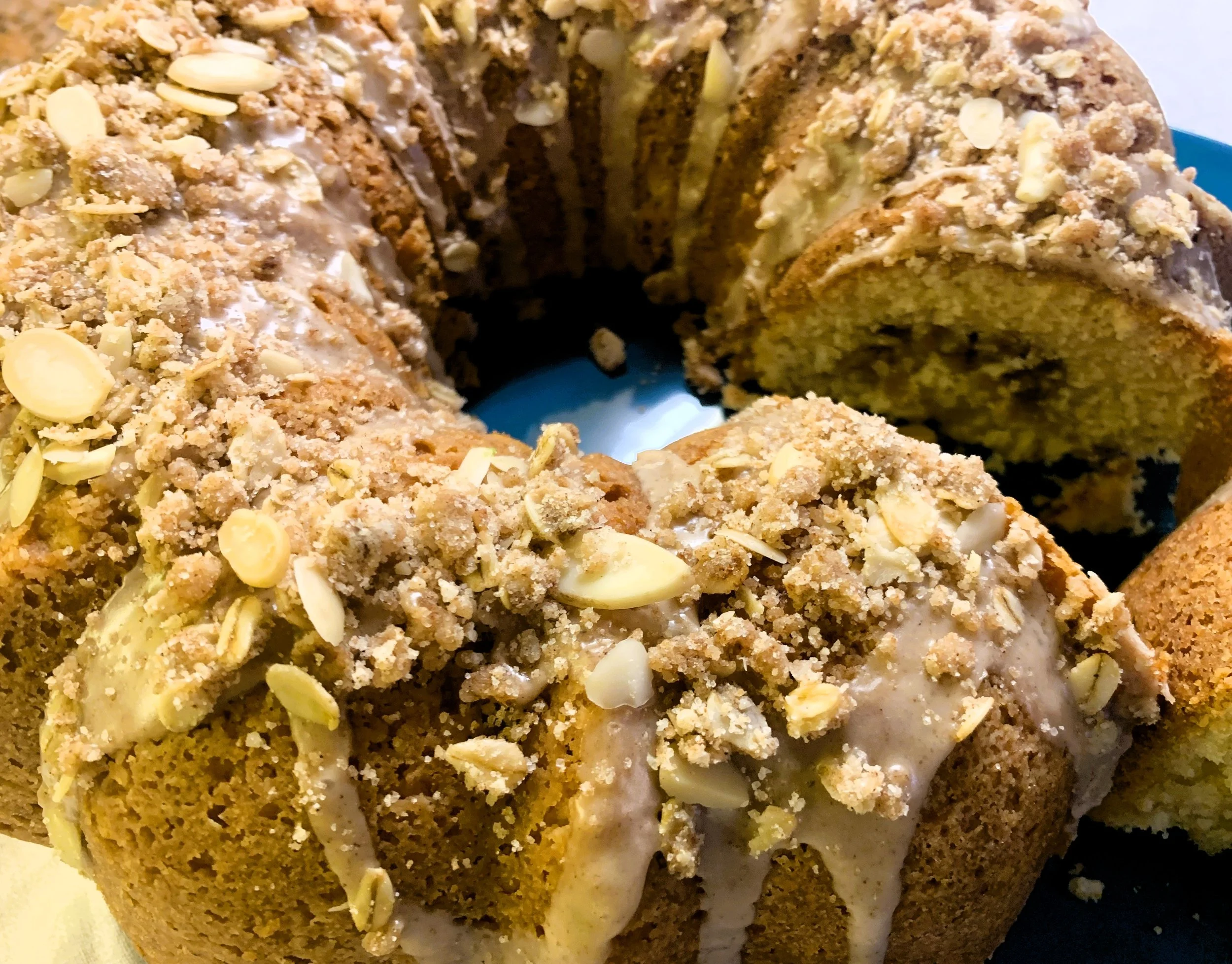 Drizzle cinnamon glaze over the top of the cooled cake and sprinkle with remaining streusel.