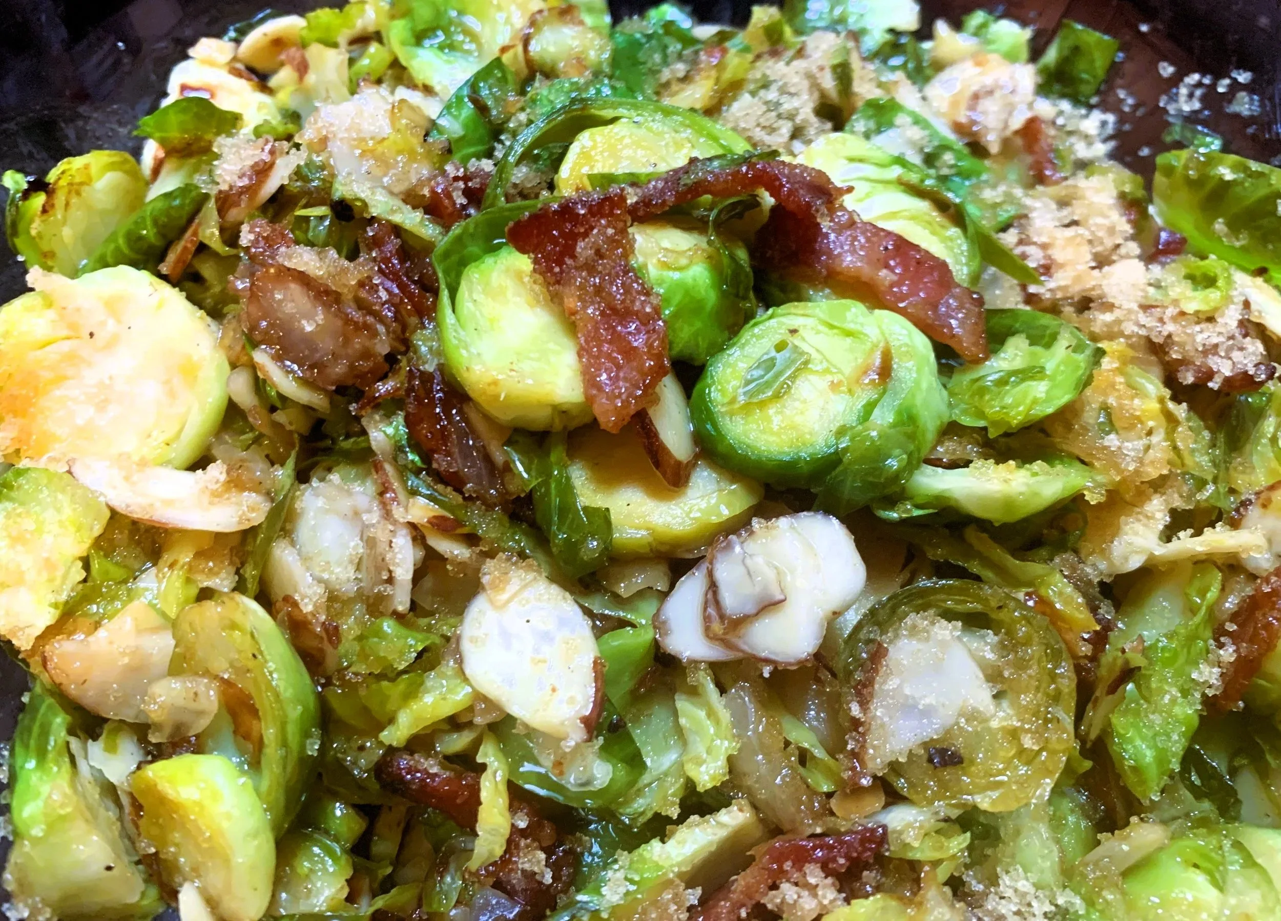A sprout lovers dream - baby earthy flavored cabbages sweetened by shallots, butter and maple syrup, with a bit of tang from the vinegar and cranberries and a nutty crunch from the bacon and almonds. Showoff sprouts!