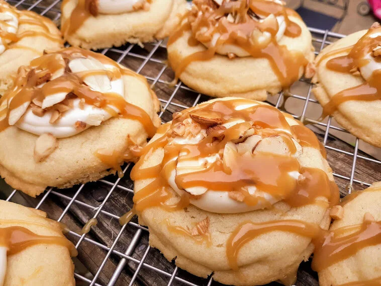 -Frost each cookie with a dollop of cream cheese frosting either by piping a mound on each cooking or swirling it on with a knife. Drizzle the caramel over the top of the cookies then sprinkle with almonds and toffee bits. Let set out for about an hour before serving, to allow caramel to harden slightly.