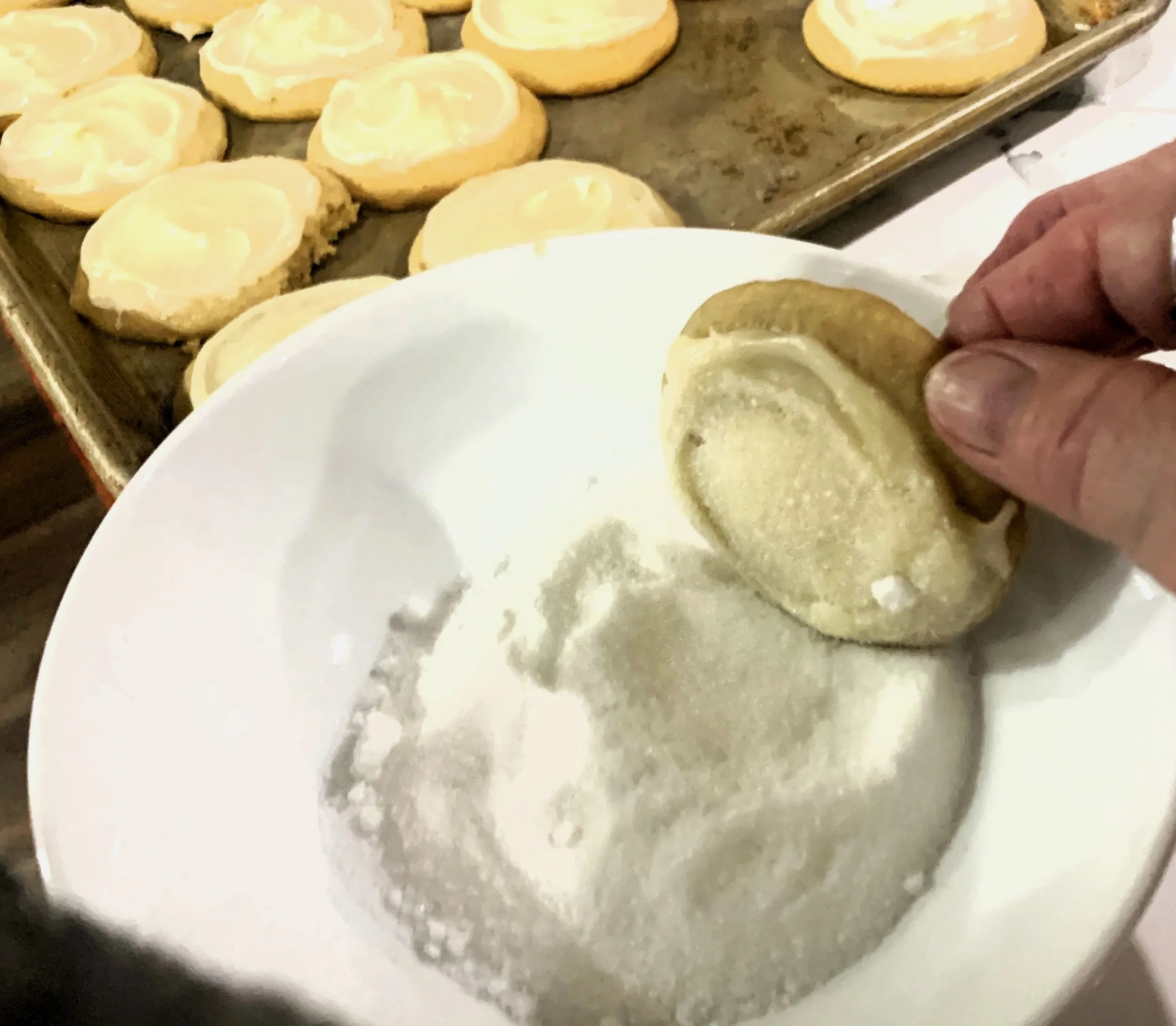 Mix the frosting ingredients until very smooth, spread generously on the tops of the cooled cookies, then dip into sugar.