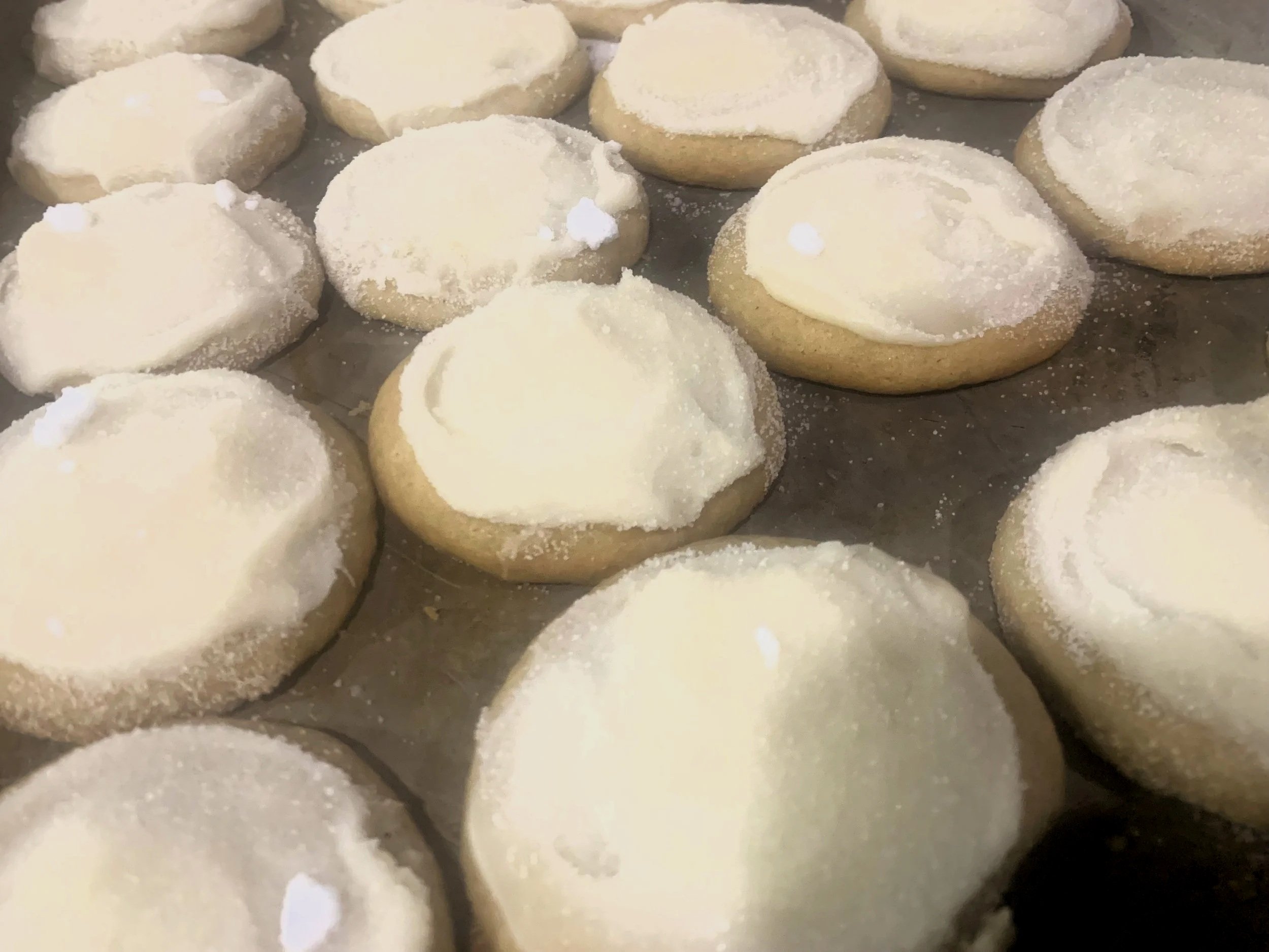 Using a culinary butane torch, pass the flame across to the top of the cookies to melt the sugar and the frosting is brown in some areas.