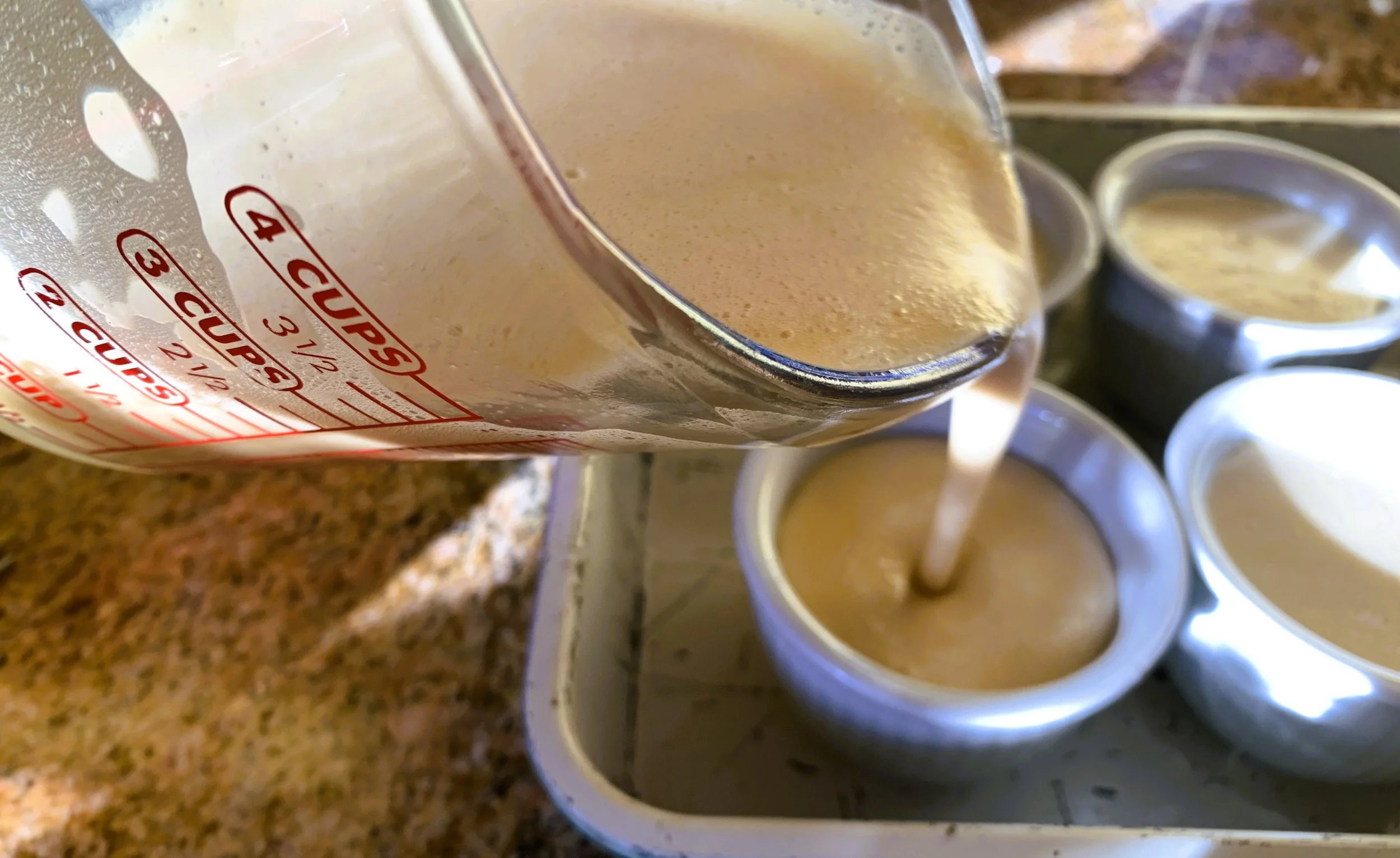 Place the ramekins in the water, then pour in the batter to about 1/3 inch from the top.