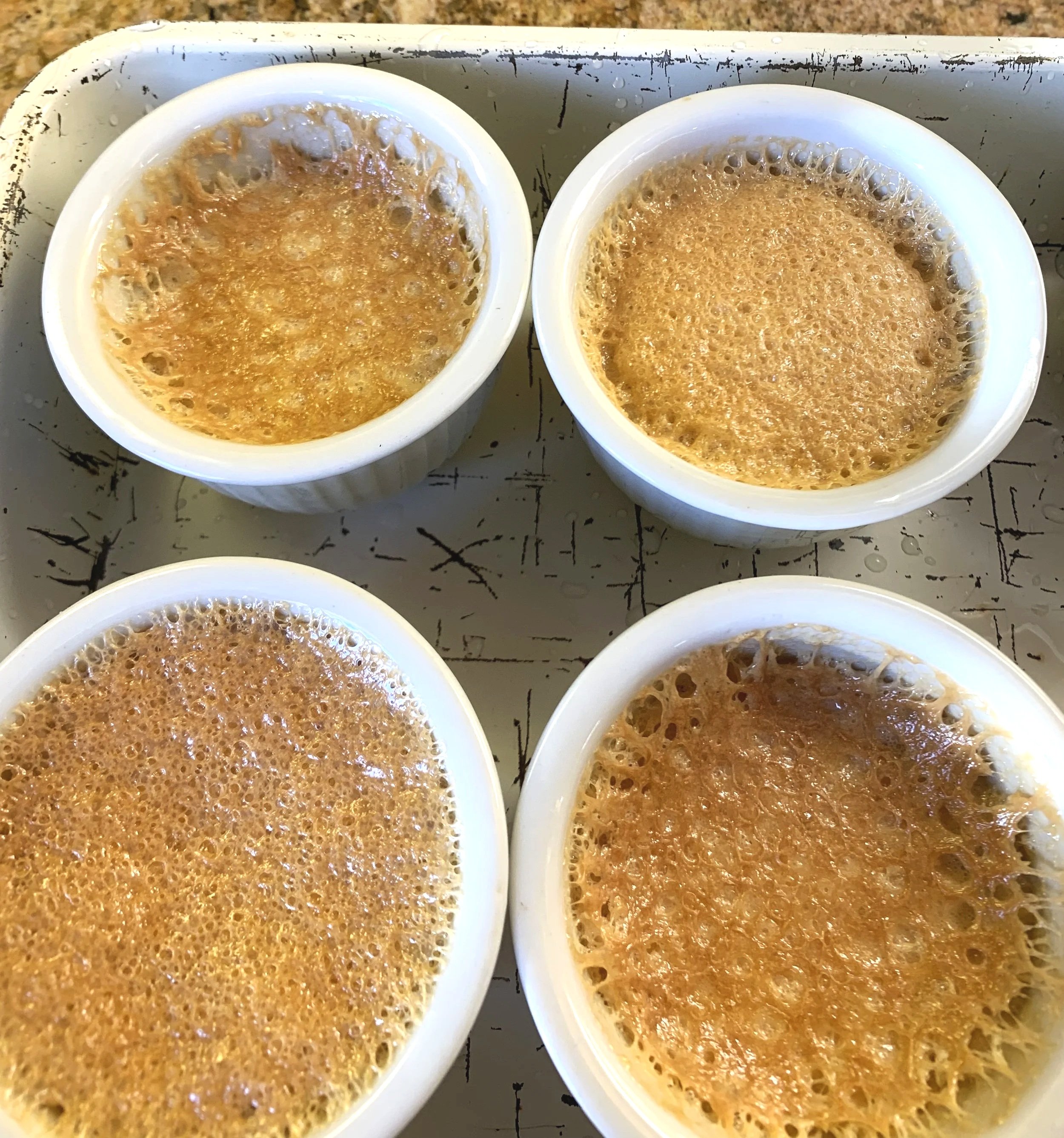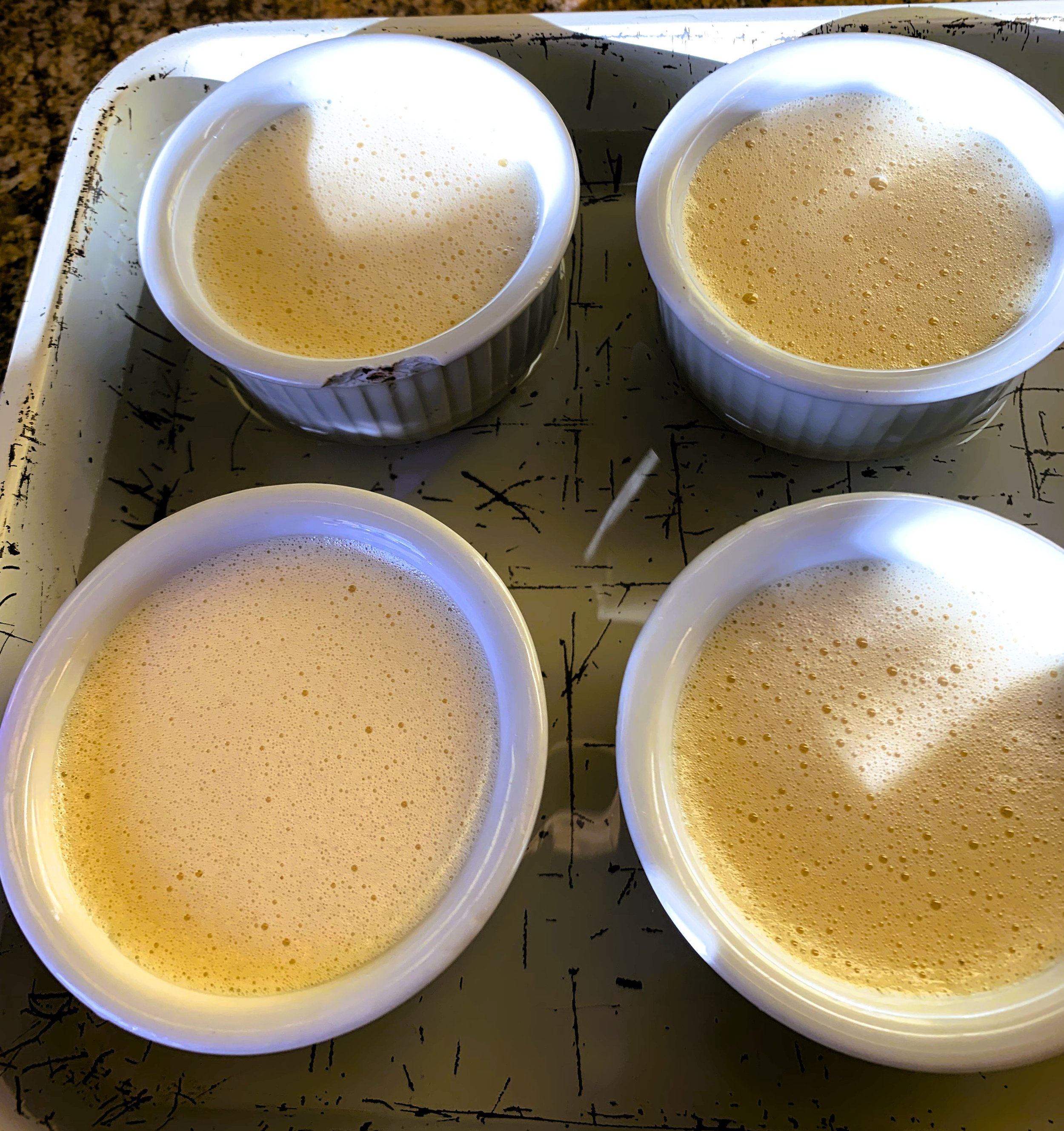 **Depending on your oven, the time to bake these custards can vary quite a bit. Aim for the 20 minutes then test by jiggling one of the ramekins and if the batter is still runny, cook another 5 minutes, then check again. Repeat until the center of one has a slight jiggle to it. Then remove from the oven.