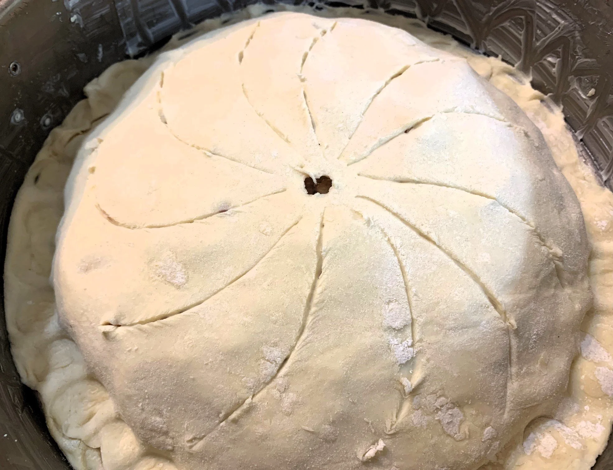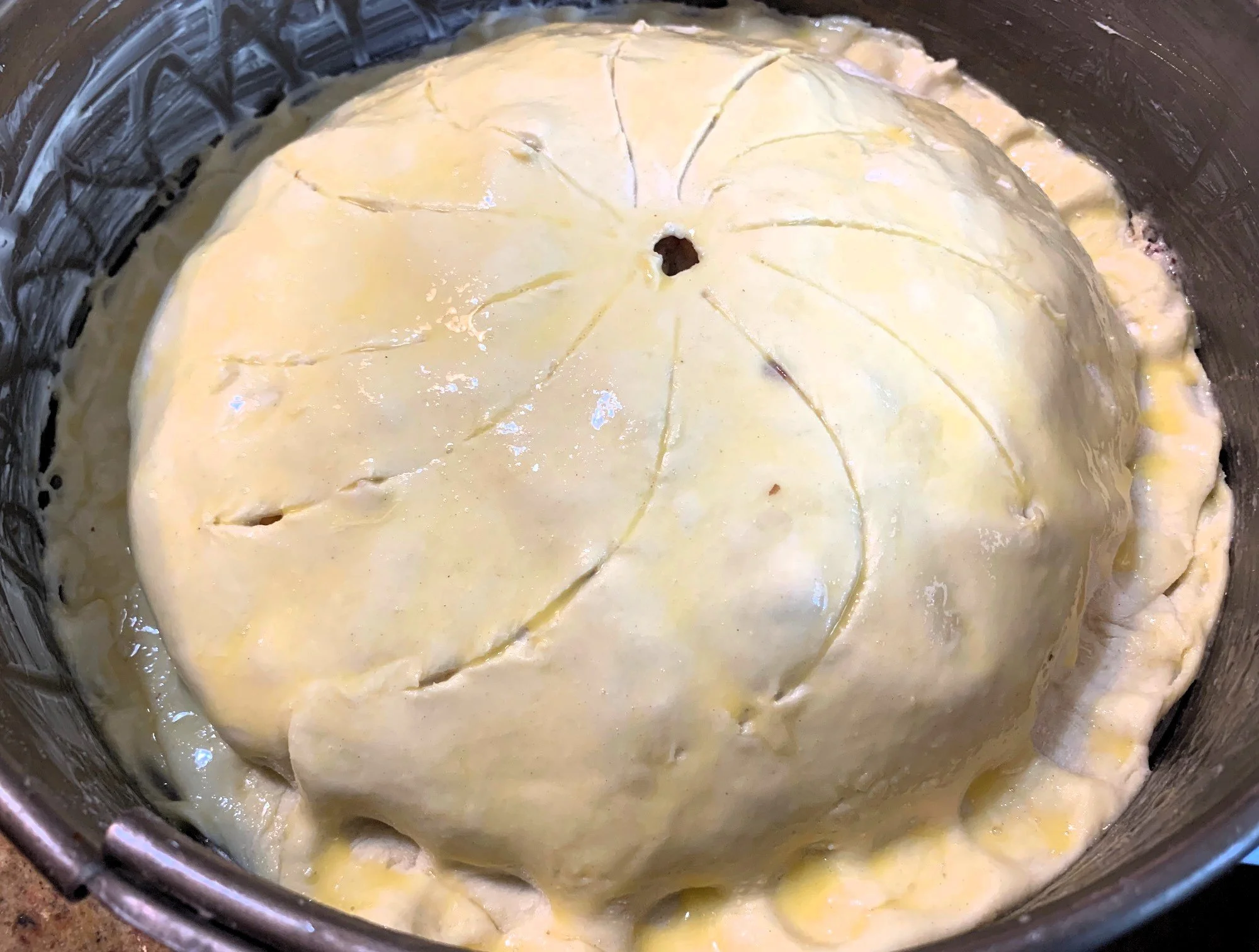 -Place the 2nd round gently on top of the filling and cheese and push lightly to bring the edges of the top round down around the sides of the filling until the edges of the dough of the top round and the second round meet. (If using the spring form pan, this isn’t necessary. Just use a knife around the edges to push the edges of the top round down toward the bottom of the pan. The 2 rounds will not meet.) For the pastry prepared on the the baking sheet, pinch the edges together to seal the top pastry dough to the bottom. Then crimp the edges firmly in a decorative manner to seal the edges as much as possible.