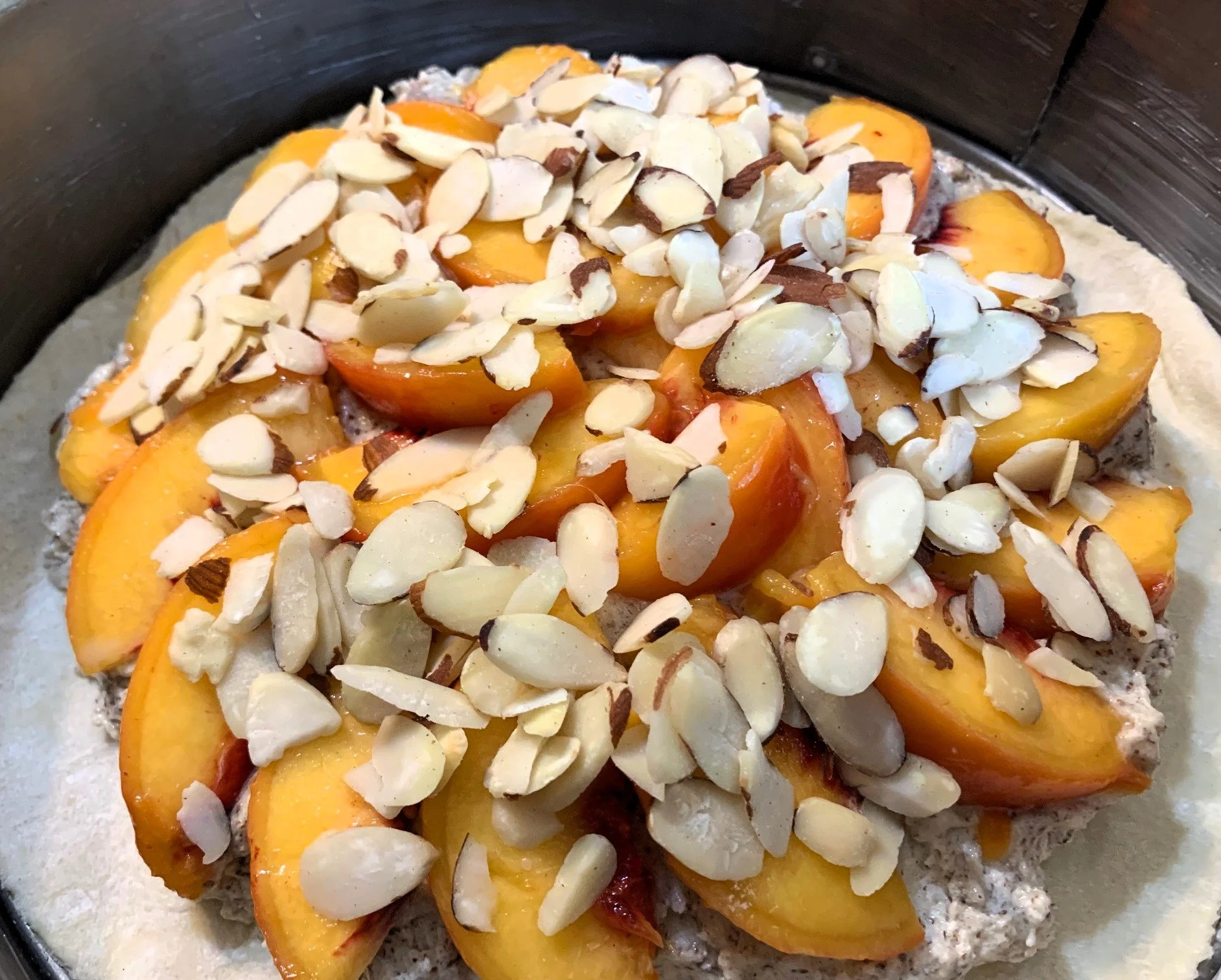 Peaches go beautifully with frangipane and more almonds on top, for the crunch, is always a good way to go!