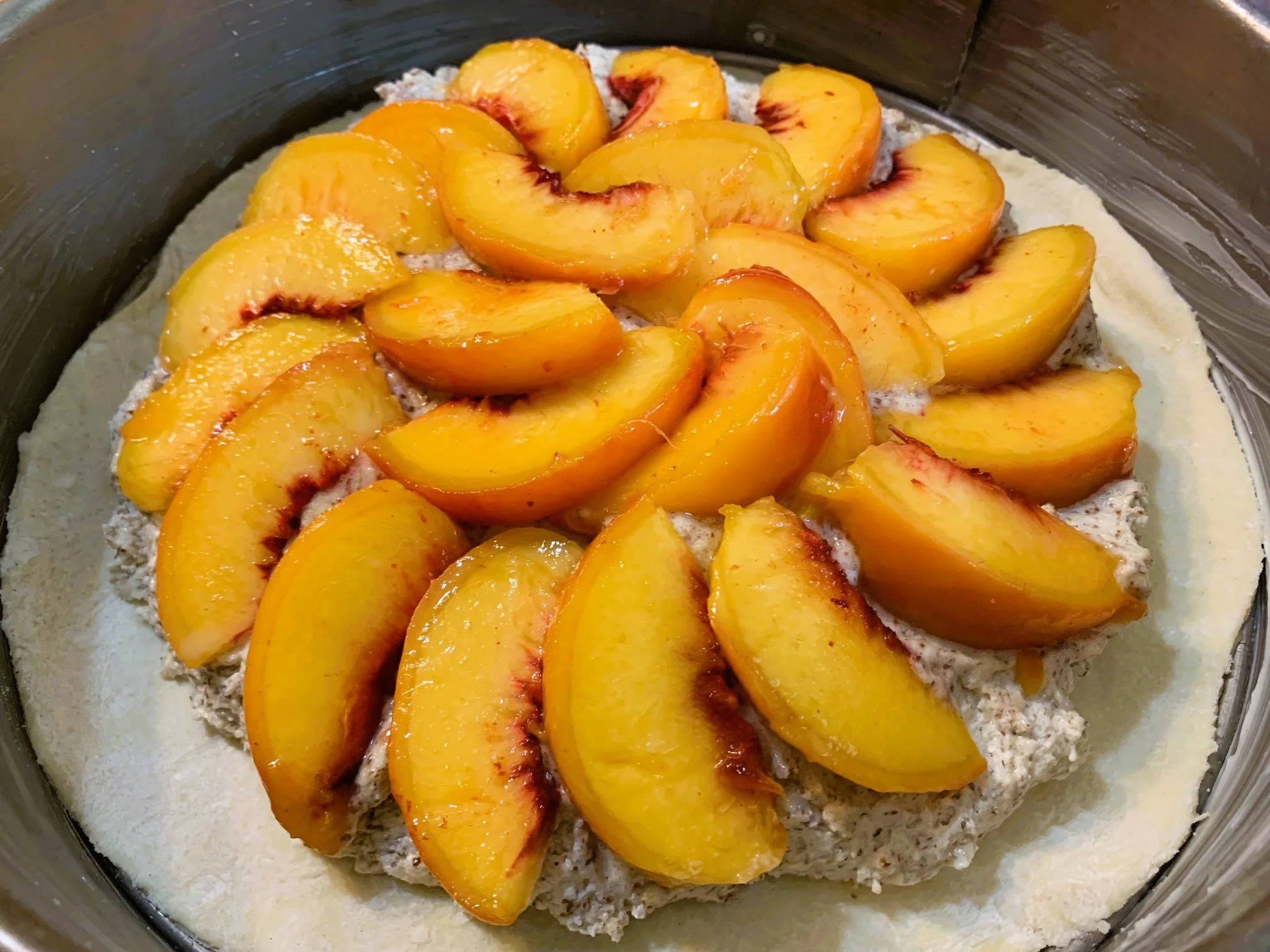 -Place the 2nd round gently on top of the filling and peaches and push lightly to bring the edges of the top round down around the sides of the filling until the edges of the dough of the top round and the second round meet. (If using the spring form pan, this isn’t necessary. Just use a knife around the edges to push the edges of the top round down toward the bottom of the pan. The 2 rounds will not meet.) For the pastry on the the baking sheet, pinch the edges together to seal the top pastry dough to the bottom. Then crimp the edges firmly in a decorate manner and to seal the edges as much as possible.