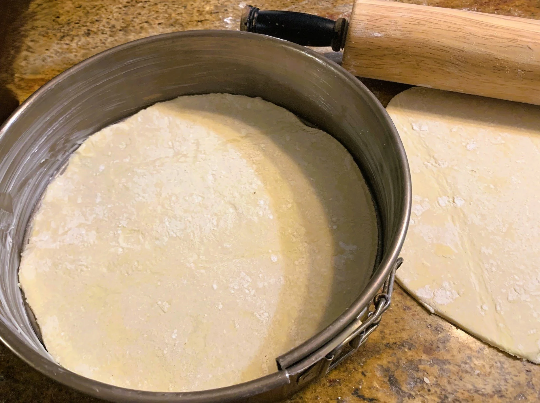#1 - With soft butter, grease the bottom and sides of a 10 inch spring form pan. Lay one circle of pastry inside and on the bottom of the ringed pan.