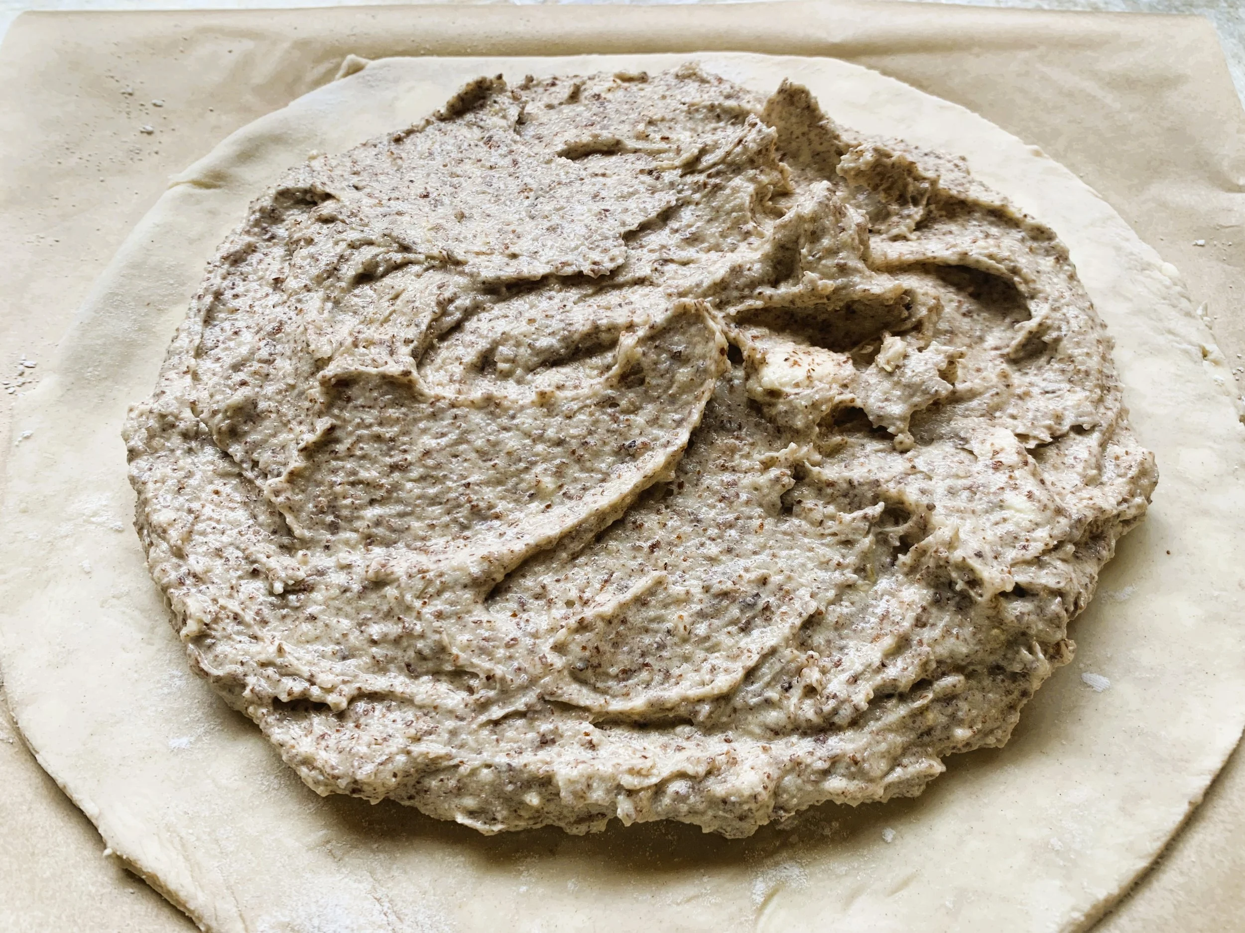 For the sweet Pithivier: Mound the frangipane filling onto the center of the bottom round, then spread it out with a spatula to within 1 inch of the edges.
