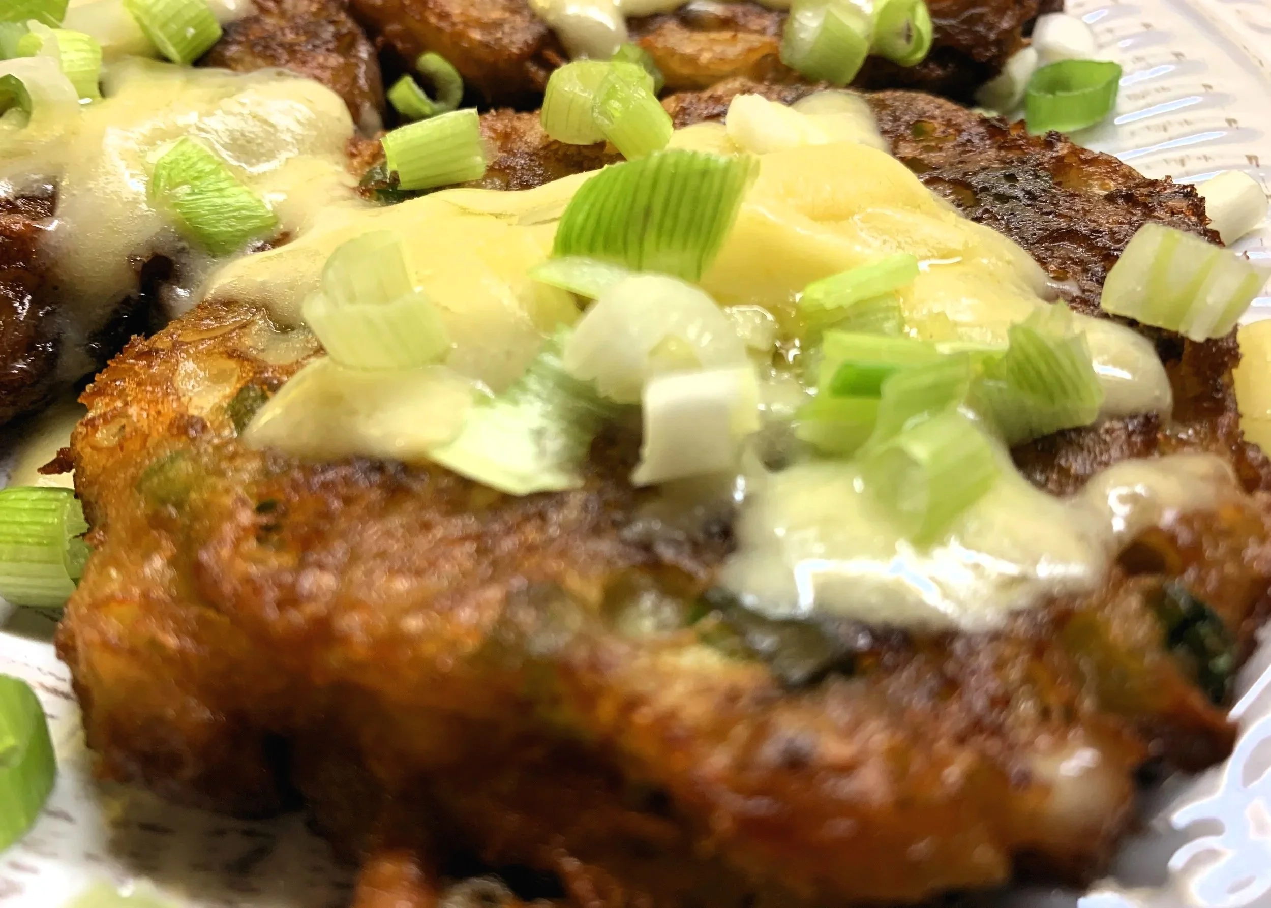 Place the cheddar cheese on top of the warm Boxtys so it melts, then garnish with a few more sliced green onions.