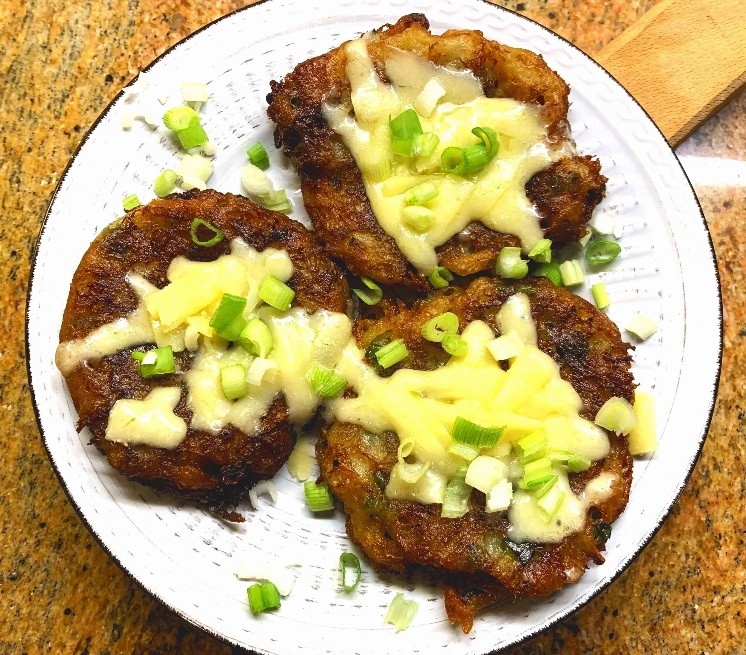 -Remove the cooked Boxty to a plate lined with kitchen paper to absorb any excess oil. Keep them warm in a low oven while you continue frying the remaining batter. Garnish with sliced green onions and serve immediately so they are still crispy on the outside. Makes about 8 Boxtys.