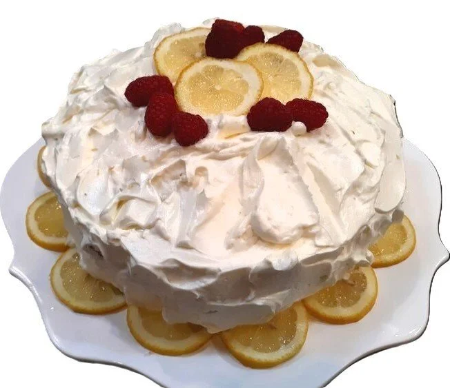 -Frost the entire cake with the cream frosting. Garnish with more whole fresh raspberries and lemon slices as desired.