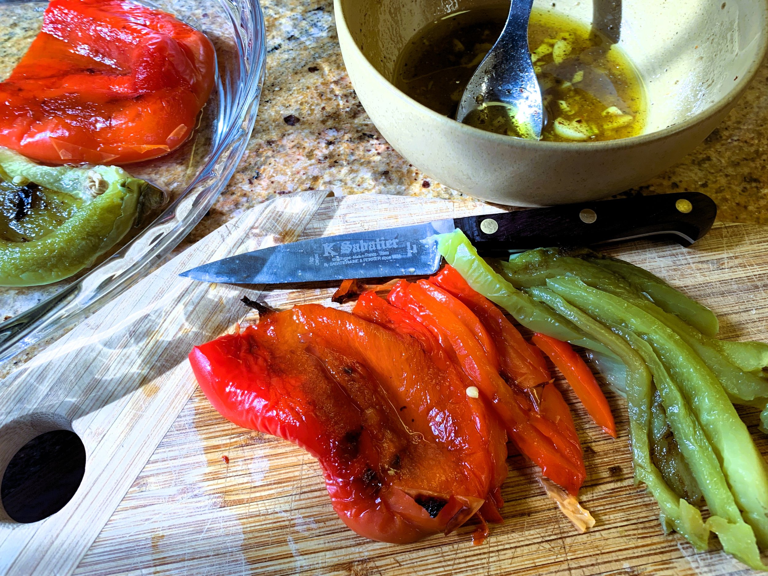 Roasted peppers until charred, then peel and slice into long ribbons. Mix ingredients for marinade and pour over peppers.