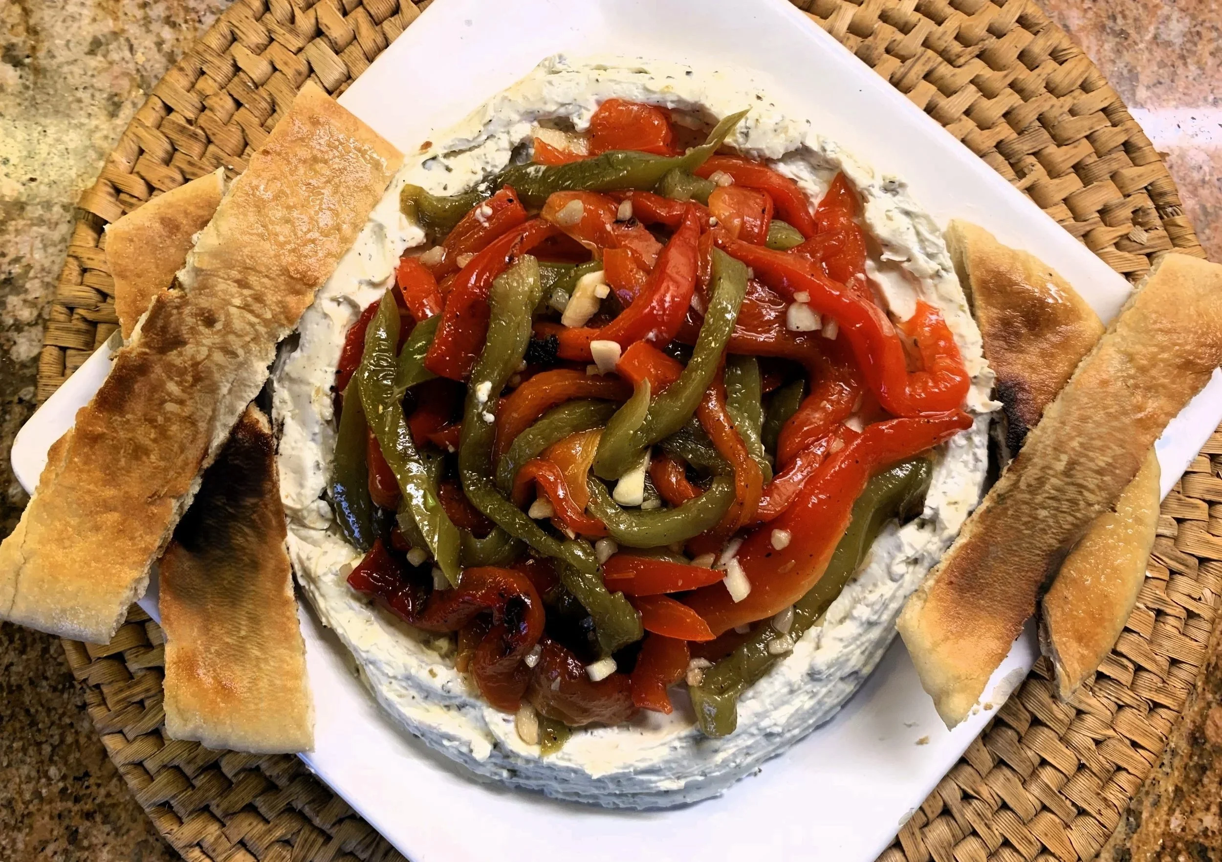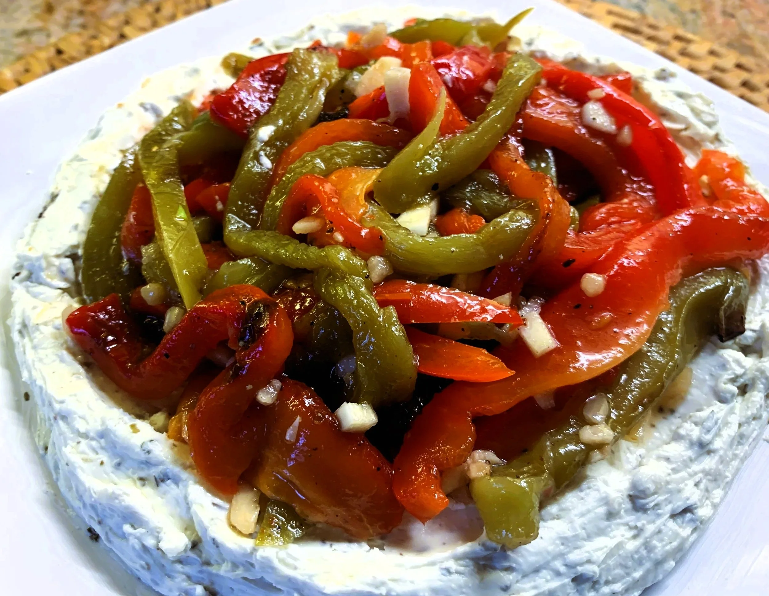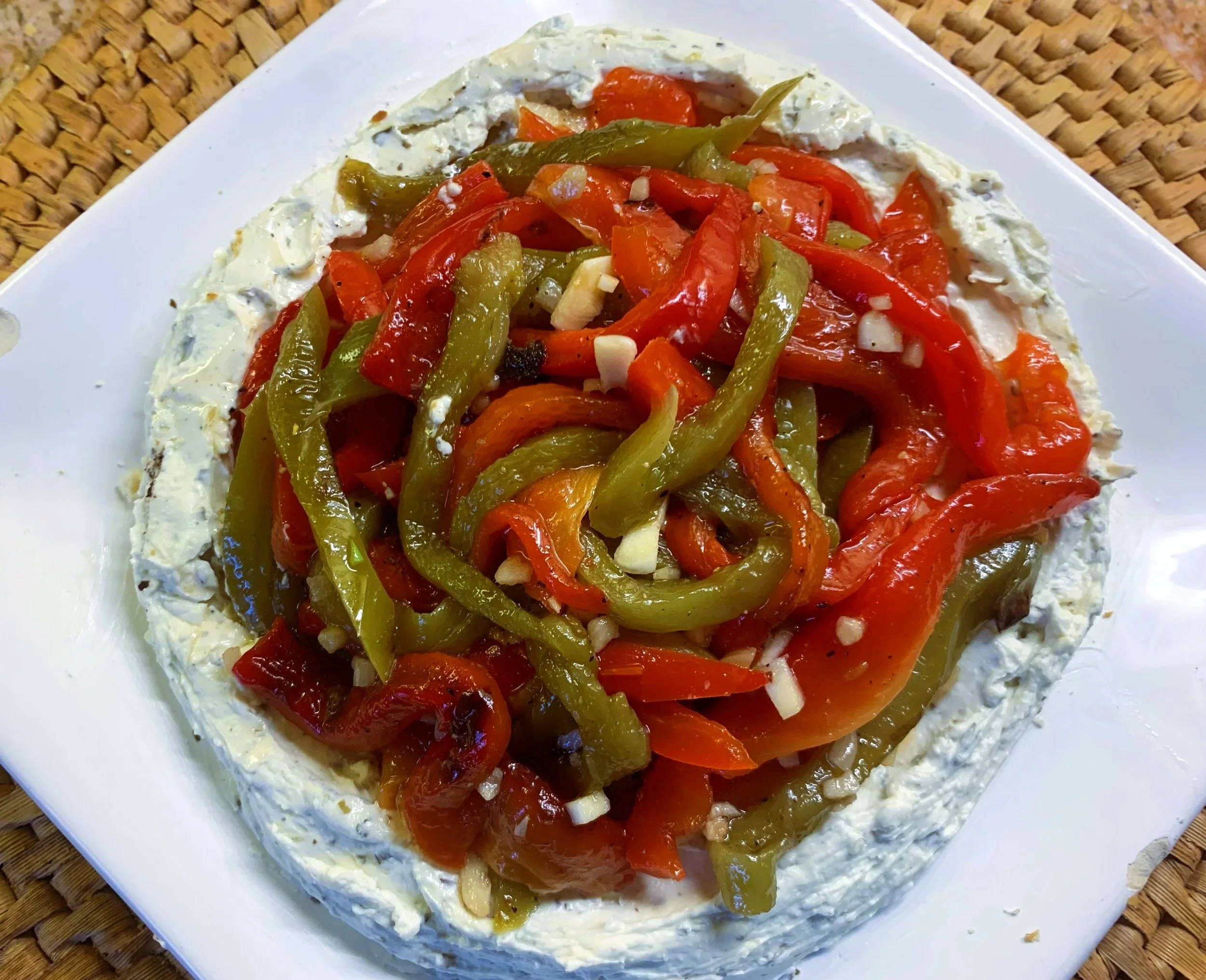 Ribbons of marinated, garlicky, red and green peppers, tangled on a bed of soft herbed cheese, create a simple yet stunning appetizer! Dip and spread on crackers or grilled bread for a simple meal or a tantalizing snack.