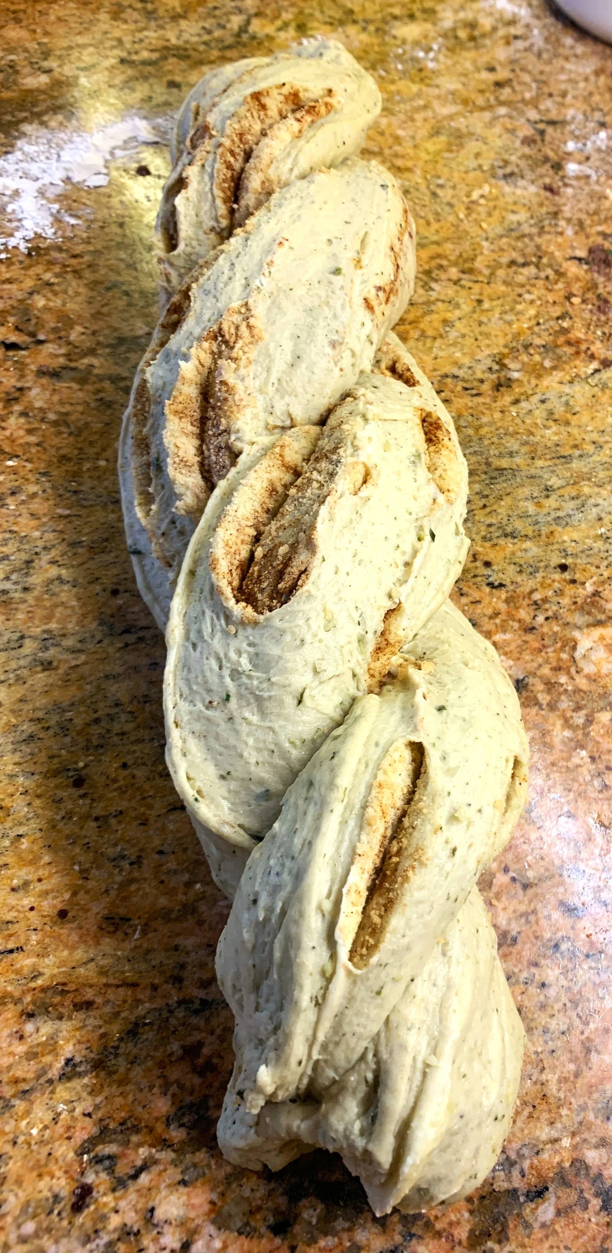 -Take the two ends of one end and pinch them firmly together, then tuck them under the end. Begin to braid (twist) the dough at that end by laying one length over the other, twisting it so that the open edges where the filling is exposed are on the top of the loaf. Continue braiding to the other end, then pinch those ends firmly together and tuck under the dough. Place the loaf on a greased cookie sheet or line the sheet with parchment paper. Cover the loaf lightly with plastic wrap or a kitchen towel and let rise in a warm place for about 45 minutes. Preheat the oven to 375 degrees and place a pan of hot water on the bottom of the oven or on a bottom rack below the center rack where you will place the bread. This helps create a moist environment to allow the bread to develop a crusty exterior.