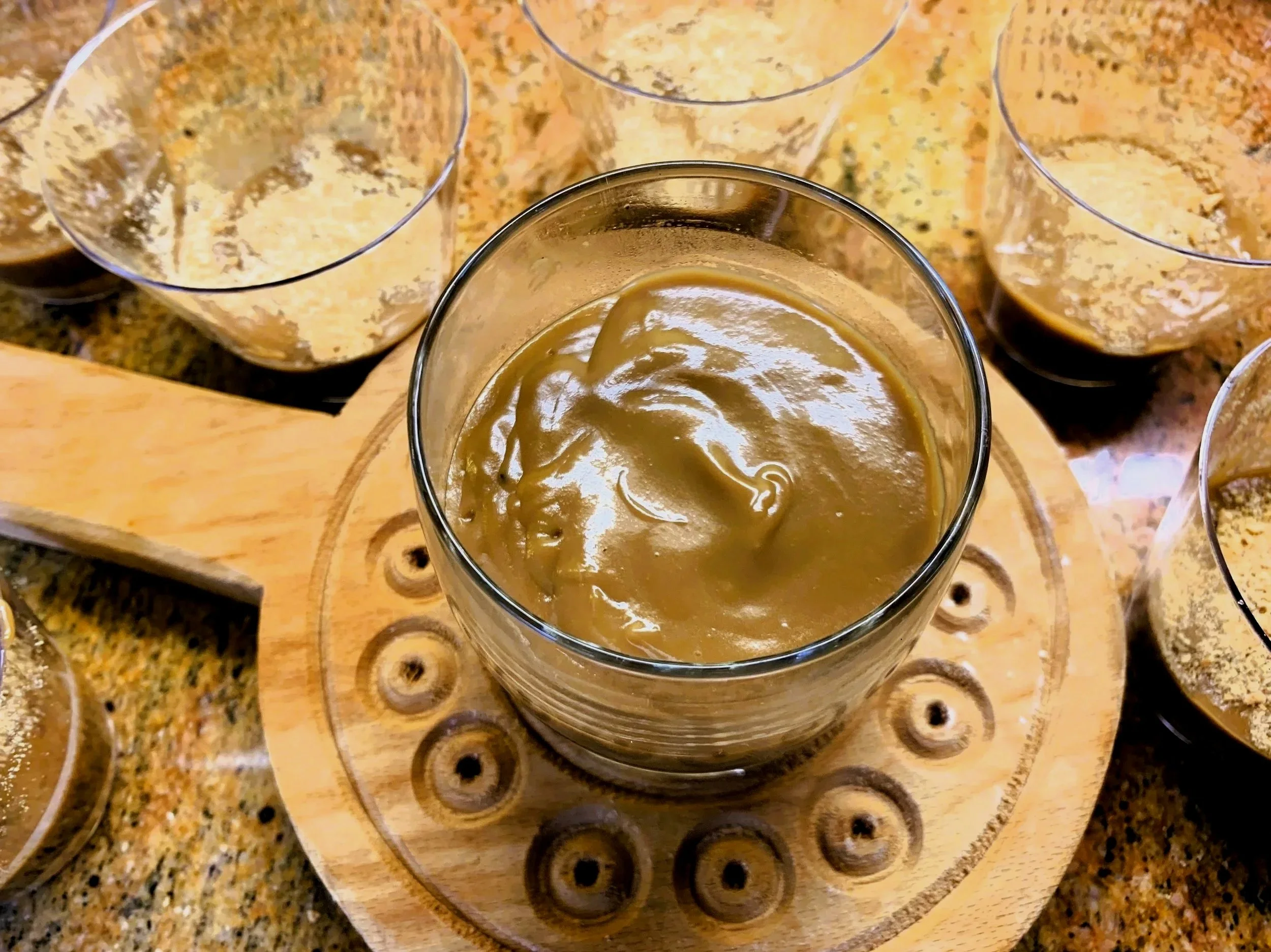 Sprinkle a layer of cookie crumbs on the bottom of each jar or ramekin then pour on a thick layer of cooled caramel pudding.